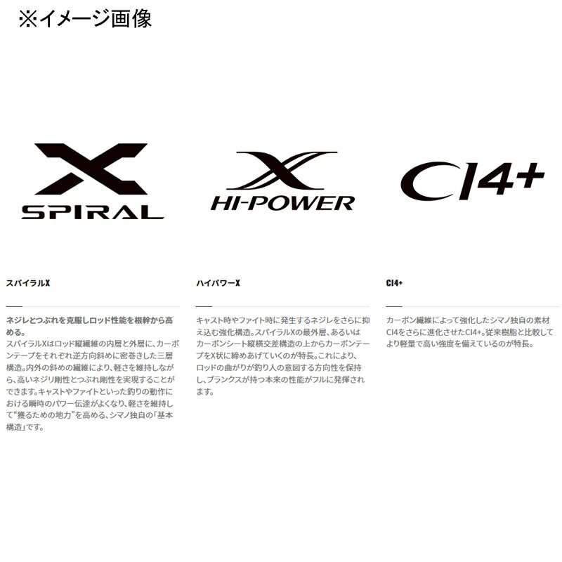 シマノ独自のロッドテクノロジーである基本構造(スパイラルX)、そして強化構造(ハイパワーX)を採用し、このゲームにおいて重要なキープキャスト&キープアクションを快適に継続可能にする軽量化を実現。