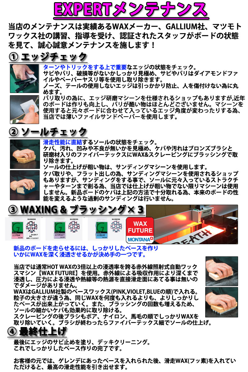 ストレスなく気持ちよく滑る為にも、大切なボードを長持ちさせる為にも必ずやっておきましょう! 『道具を持ってない』、『仕方が分からない』、『時間がない』ってかたにはオススメです! ●EXPERTメンテは毎週滑走される方や、よりボードの走りにこだわりたい方にオススメです。