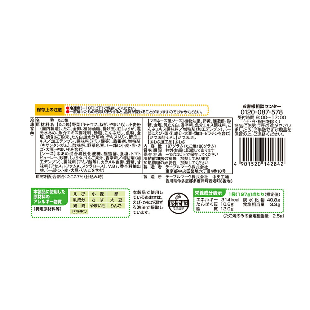 ●原材料【たこ焼】野菜(キャベツ、ねぎ、やまいも)、小麦粉(国内製造)、たこ、全卵、植物油脂、揚げ玉、紅しょうが、還元水あめ、魚介エキス調味料、砂糖、こんぶだし、魚粉、食塩、たん白加水分解物、デキストリン、酵母エキス/加工デンプン、調味料(アミノ酸等)、膨張剤、増粘剤(キサンタンガム)、酸味料、着色料(紅麹)、(一部に小麦・卵・さば・大豆・やまいもを含む) 【ソース】水あめ混合異性化液糖、醸造酢、食塩、トマトピューレー、砂糖、しょうゆ、りんご果汁、香辛料/増粘剤(加工デンプン)、調味料(アミノ酸等)、カラメル色素、酒精、甘味料(アセスルファムK、スクラロース)、V.B1、香辛料抽出物、(一部に小麦・大豆・りんごを含む) 【マヨネーズ風ソース】植物油脂、卵黄、醸造酢、砂糖、食塩、乳たん白、香辛料、魚介エキス調味料、こんぶエキス調味料/増粘剤(加工デンプン)、(一部にえび・卵・乳成分・大豆・鶏肉・ゼラチンを含む) 【かつお削りぶし】かつおぶし 【あおさ加工品】あおさ●保存方法ー18℃以下にて保存●備考さば、大豆、鶏肉、やまいも、りんご、ゼラチンを含みます。