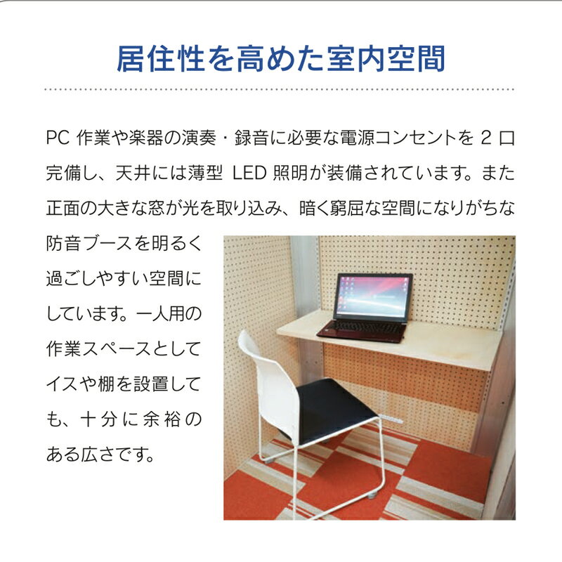 ※Dr値:遮音性能の等級を表す数値 ■居住性を高めた室内空間 PC作業や楽器の演奏・録音に必要な電源コンセントを2口完備し、天井には薄型LED照明が装備されています。
