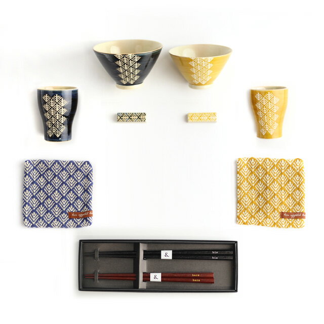 Maturite こぎん 茶碗&湯呑&箸置き&コースター&ヒズアンドハーズ 夫婦箸BOXセット 結婚祝いや新築祝いなどのギフトに贈りたいペア食器セット モダンなデザインがおしゃれな日本製の茶碗&湯呑み&箸置き&コースター&お箸のセット。